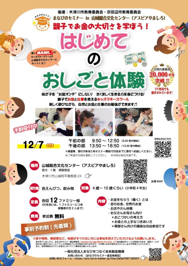 12月7日(日)【山城総合文化センター(アスピアやましろ)】木津川市教育委員会・京田辺市教育委員会後援:キッズマネースクール情報