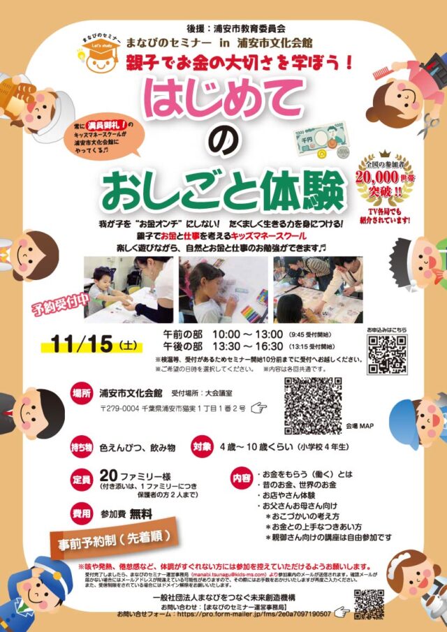 11月15日(土)【浦安市文化会館】浦安市教育委員会後援:キッズマネースクール情報